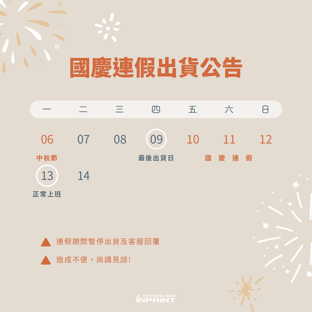 暫停出貨日:2025年10月10日(五)~2025年10月12日(日)。