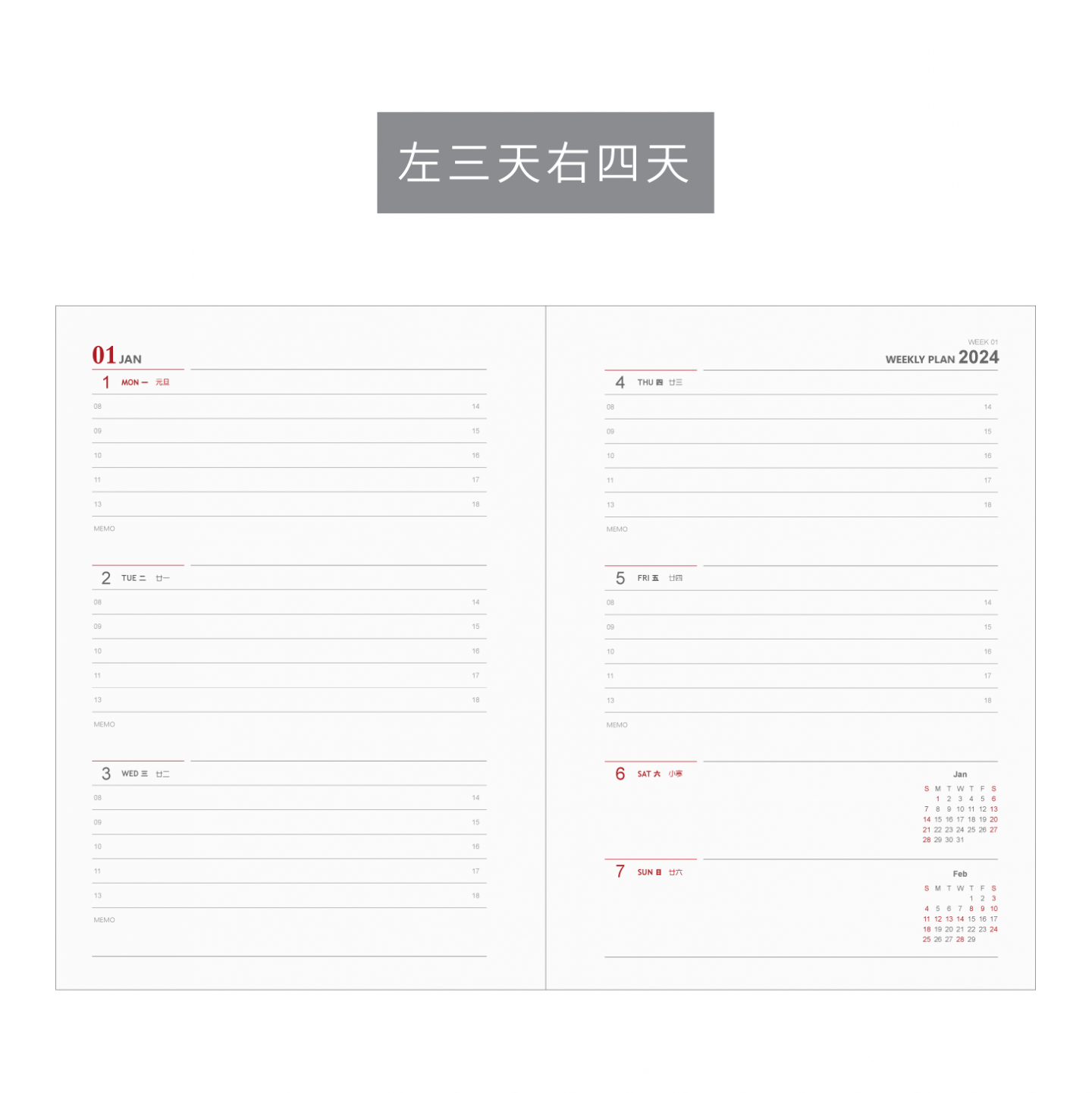一本在手的工商日誌,除了高質感的皮質封面,更需要搭配經過設計規劃、功能性、品味兼具的內頁,讓日理萬機的您,更您藉由此提升工作效率,創造無限可能。內頁紙質採用森態道林紙,書寫流利,久看不傷眼力。 規格:左三天右四天 尺寸:活頁6孔-145X208mm 材質:森態道林紙80P/ 96張 192頁 顏色:雙色印刷 包裝 : OPP袋